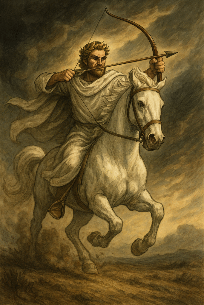 ”Jag såg, och se: en vit häst, och han som satt på den hade en båge, och en segerkrans gavs åt honom, och han drog ut som segerherre för att segra.”