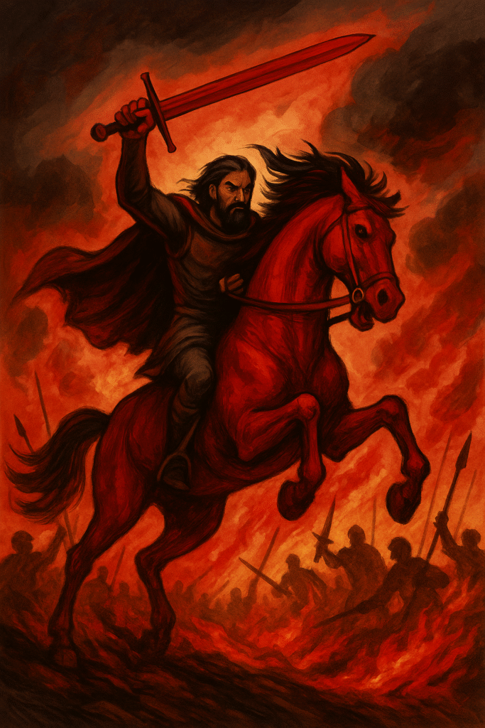 ”En annan häst, en eldröd, kom fram, och han som satt på den fick makt att ta bort freden från jorden så att människorna skulle slakta varandra.”