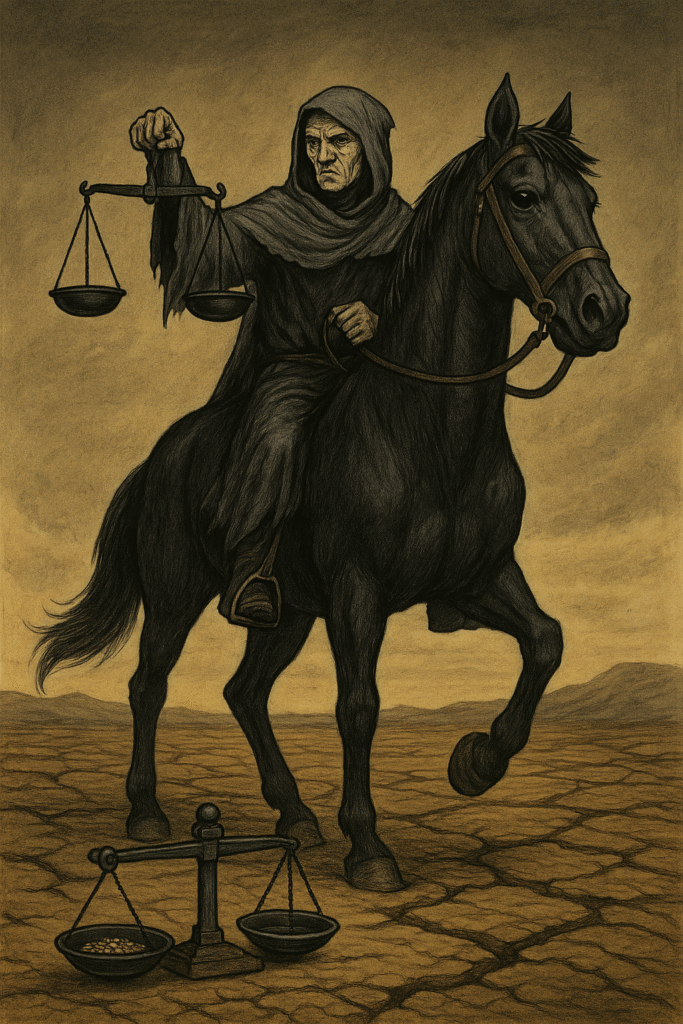 ”Jag såg, och se: en svart häst. Och han som satt på den hade en våg i handen… ett mått vete för en denar…”