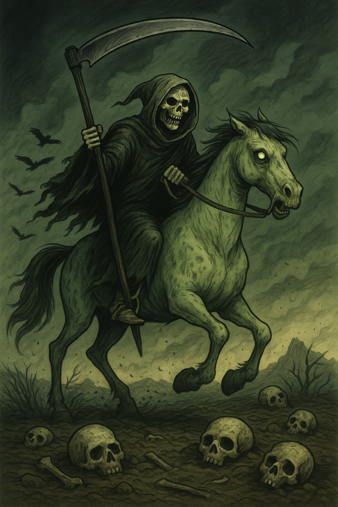 ”Och se: en gulblek häst, och han som satt på den hette Döden, och Dödsriket följde honom… att döda med svärd, svält, pest och vilda djur.”