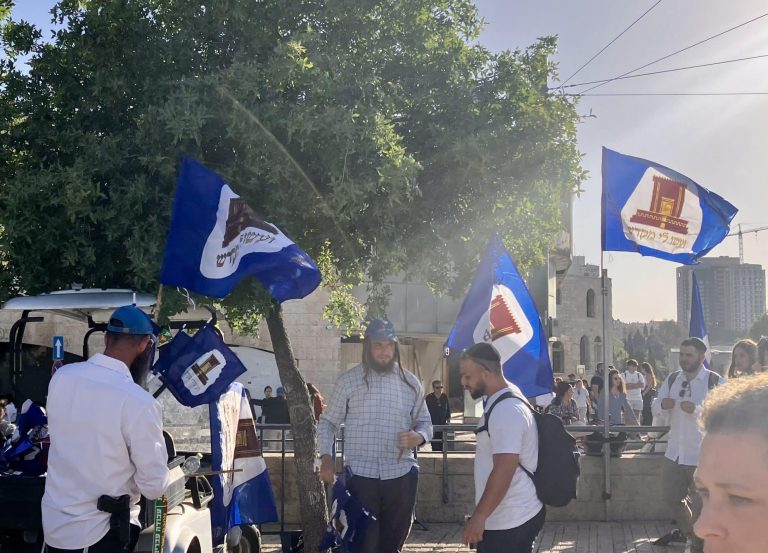 Det du ser bilden är det som kallas för ”Third temple flag” och sätts just nu upp lite överallt runtom i Israel.