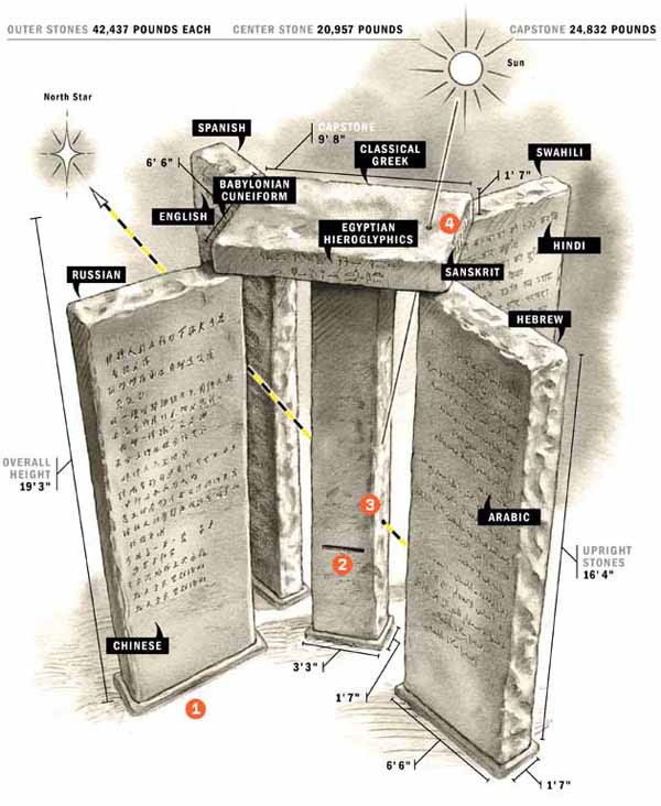 Totalt var detta meddelande skrivet åtta gånger på åtta olika språk: engelska, spanska, swahili, hindi, kinesiska, ryska, arabiska och hebreiska. Dessa språken valdes eftersom de representerade större delen av mänskligheten, förutom hebreiska, som valdes på grund av dess kopplingar till judendom och kristendom. Monumentet kallades ibland för ”Amerikas Stonehenge” även om de massiva stenblocken på Stonehenge förvisso är ännu större.