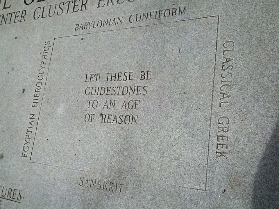 Utöver dessa fyra enorma stenplattor med budord från dessa åtta olika språk, så var det en stor stenplatta lagd över monumentet med ett kortare meddelande som var skrivet på fyra antika språk: babyloniska, klassisk (koine) grekiska, sanskrit och egyptiska hieroglyfer. På vardera sida av denna sten stod det: ”Låt dessa vara vägvisare till förnuftets tidsålder”.
