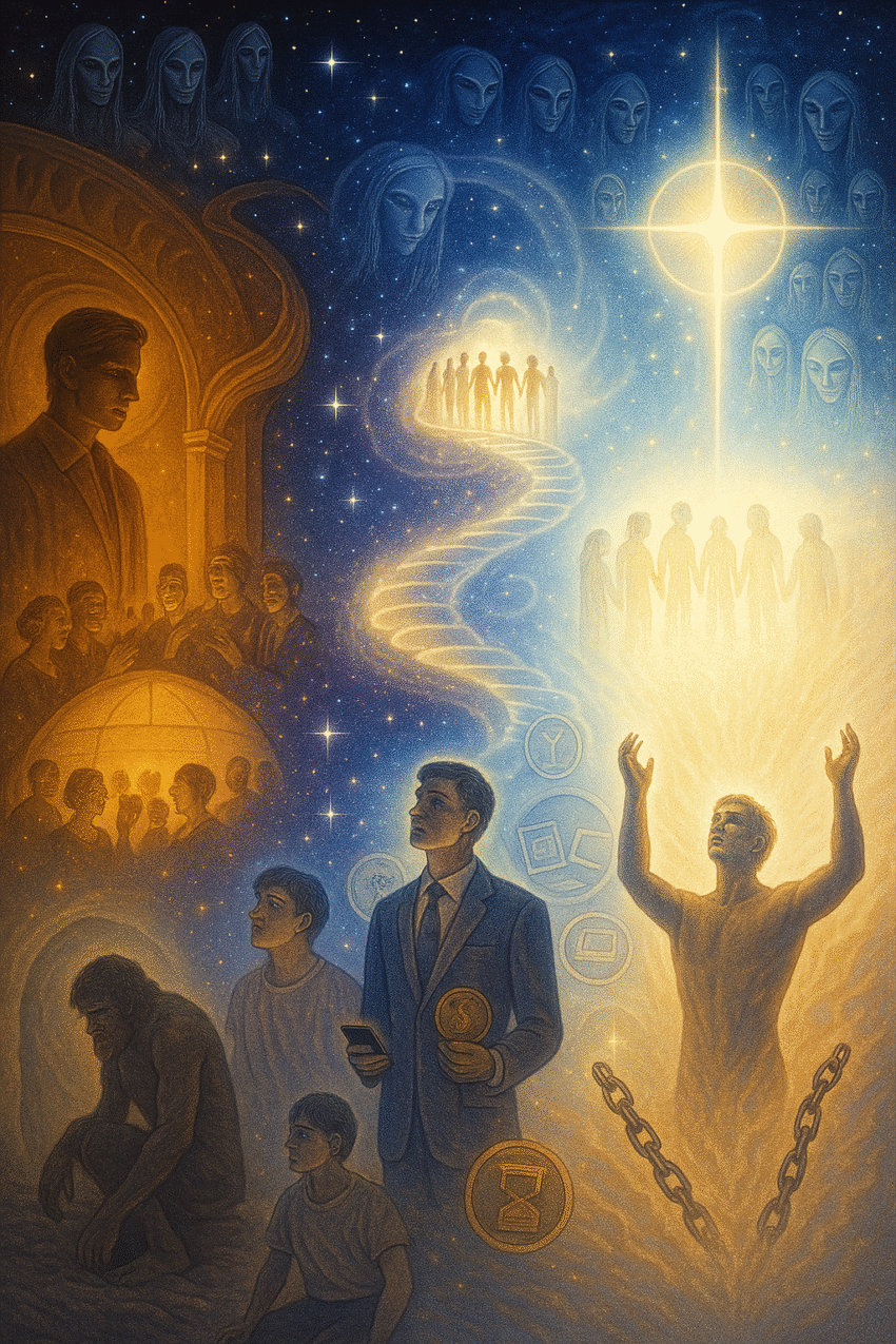 I 3D lever vi ofta styrda av logik, samhällsstrukturer, normer och rädslor för brist, förlust eller död. Samtidigt är det också här vi får möjlighet att utveckla självkännedom, fatta fria beslut och prövas i våra val. 3D är därför både en dimension av begränsningar och av tillväxt, eftersom utmaningarna här driver oss till att söka något mer meningsfullt.